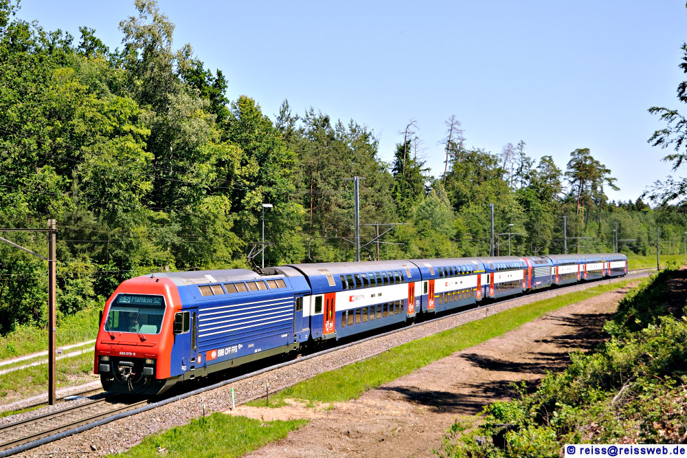 DPZ 450 079 (sie trägt das Wappen von Jestetten) fährt mit einer S5 nach Pfäffikon (Schwyz) in Hüntwangen-Wil ein (30.09.2009).