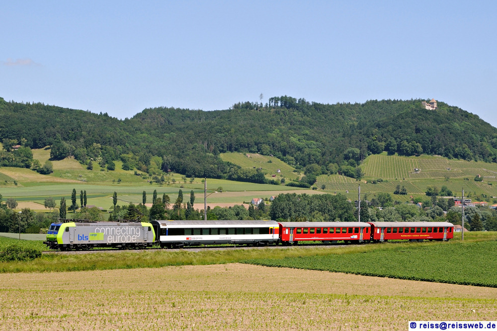 BLS 485 005 überführt den "Salon de Luxe" und zwei EW I B der ehemaligen Rorschach – Heiden-Bergbahn nach Schaffhausen, wo die Wagen für zwei Extrafahrten benötigt wurden (Etzwilen, 30.05.2009).