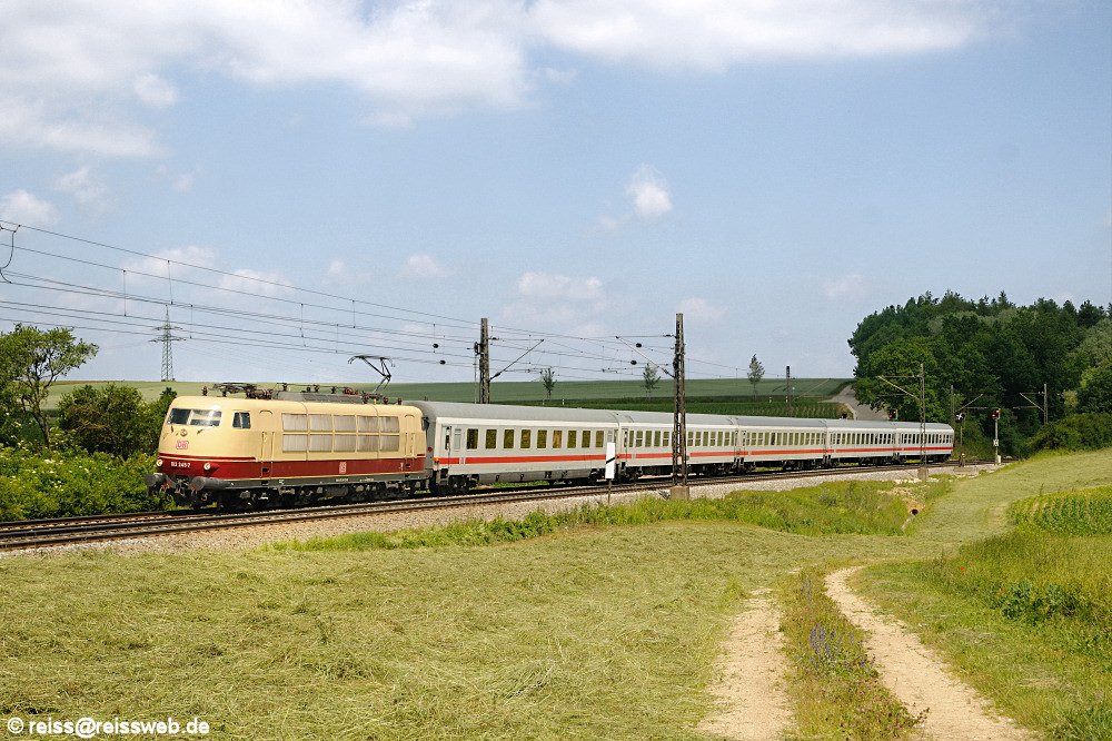 Am letzten Plantag ihres ICE-Ersatzumlaufes erreicht 103 245 mit IC 73943 Nürnberg - München in wenigen Minuten Donauwörth (13.06.2009).