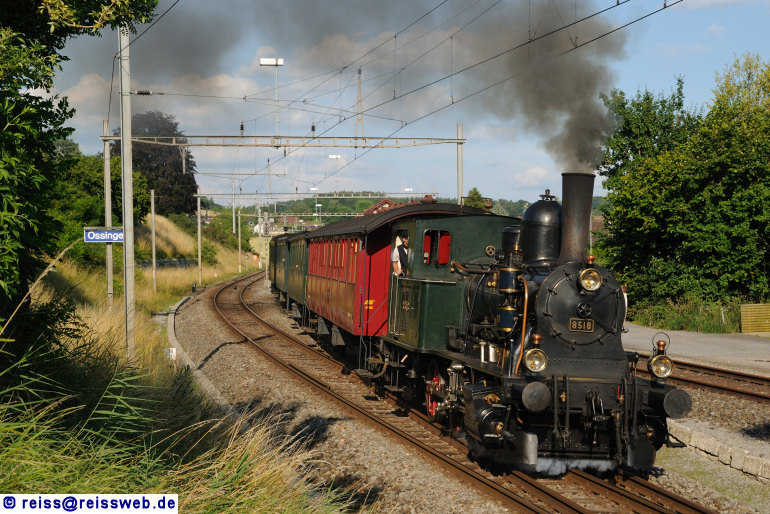 des VDM fuhr E 3/3 8518 des DVZO am 28.06.2009 die Dampffahrten zwischen Stein a. Rhein und Ramsen - die Aufnahme entstand in Ossingen auf der Fahrt zurück nach Bauma.