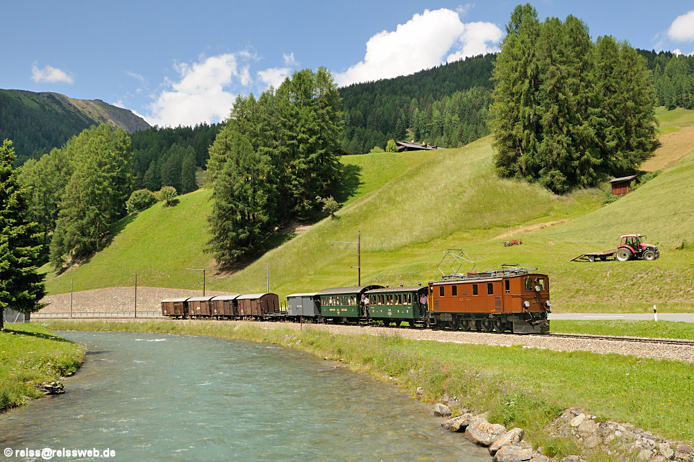 Die selten eingesetzte Ge 4/6 Nr. 353 wurde für die 100-Jahr-Feier der Strecke Davos - Filisur aus dem Engadin geholt. Mit einem "historischen" GmP fährt sie am 04.07.2009 von Filisur nach Davos.
