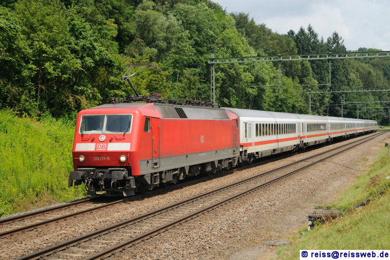 Wenige Minuten später kommt der "ICE 183", jedoch in Form eines Ersatzzuges mit 120 135 an der Spitze (Thayngen, 05.07.2009).