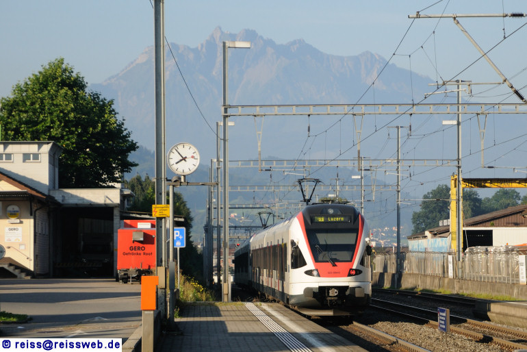 Den Pilatus fest im Blick haben die beiden Flirt, die als S1 am 05.08.2009 Gisikon-Root mit Ziel Luzern verlassen haben.