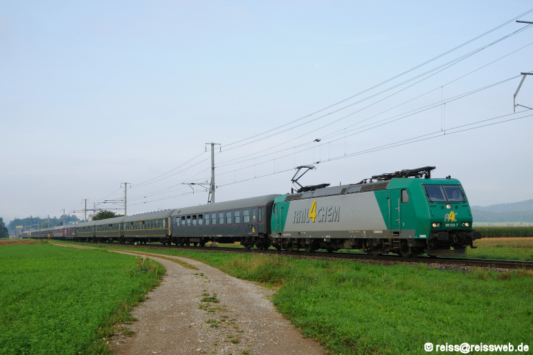 Wie bereits in den Vorjahren führte die SVG einen langen Sonderzug (13 Wagen) von Stuttgart nach Zürich zur 18. Streetparade. Zuglok war 185 533 - sie wurde auf der Rückfahrt am Sonntagmorgen (09.08.2009) bei Rafz aufgenommen.