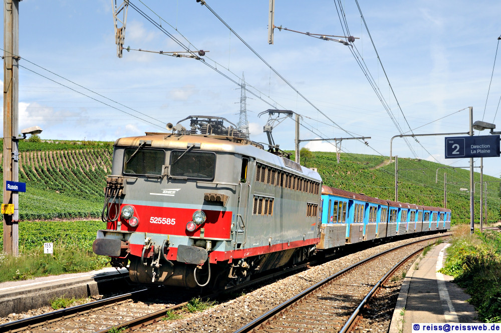 BB 25585 mit einer RRR-Garnitur wurde im Sommer 2009 mietweise von den SBB auf der Strecke Genf - La Plaine (damals noch 1,5 kV Gleichstrom) eingesetzt (Russin, 14.08.2009).