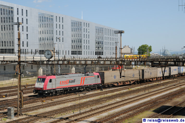 | Auf der Güterlinie Basel Bad Bf - RB Muttenz wurde am Wochenende 15./16.08. eine Brücke ausgewechselt. Einige Güterzüge in Sandwich-Traktion wurden mit Spitzkehre über Basel SBB geführt, darunter ein Crossrail-Zug mit 185 596 und 185 599 am anderen Ende (15.08.09). |