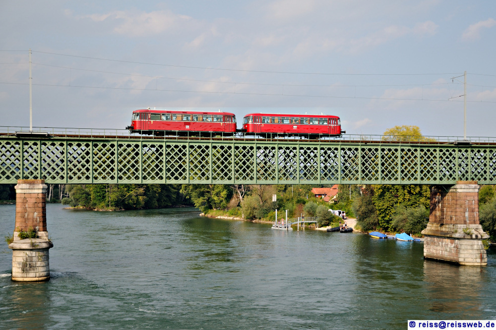 Die Schienenbus-Garnitur des Deutschen Dampflokomotiv-Museums in Neuenmarkt (796 739 & 996 701), kam am 22/23. August 2009 beim Jubiläum "150 Jahre Waldshut - Turgi zum Einsatz, hier bei einer der Fahrten über die Rheinbrücke (22.08.2009).