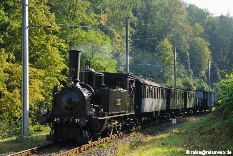 | A2 Nr. 35 der ehemaligen Jura-Simplon-Bahn war beim Jubiläum 150 Jahre Waldshut - Turgi im Einsatz - am Morgen des 23.08.2009 führte sie einen Ersatz-Planzug über die Rheinbrücke hinüber nach Waldshut. Die Aufnahme entstand bei der Einfahrt in Koblenz. |
