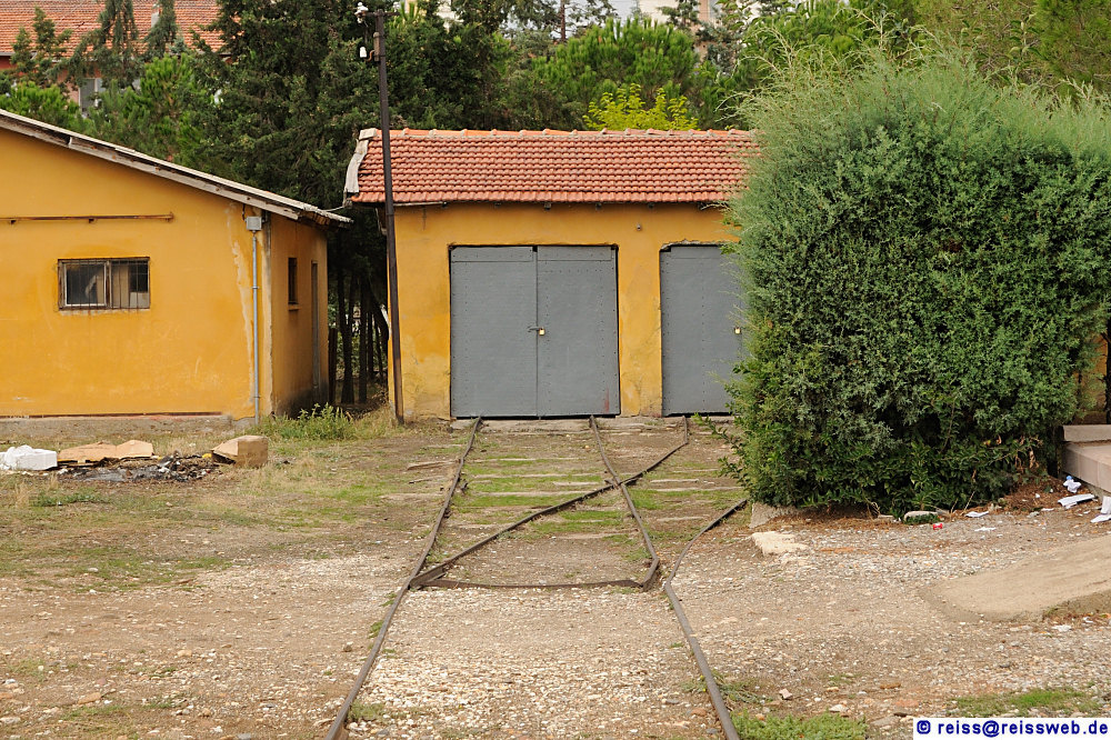 In Uşak gab es eine interessante Gleisanlage, die rechtwinklig zu den Normalspurgleisen und mit einer sehr speziellen Weiche zu einem zweiständigen Schuppen für Draisinen oder ähnliche Fahrzeuge führte (19.09.2009).