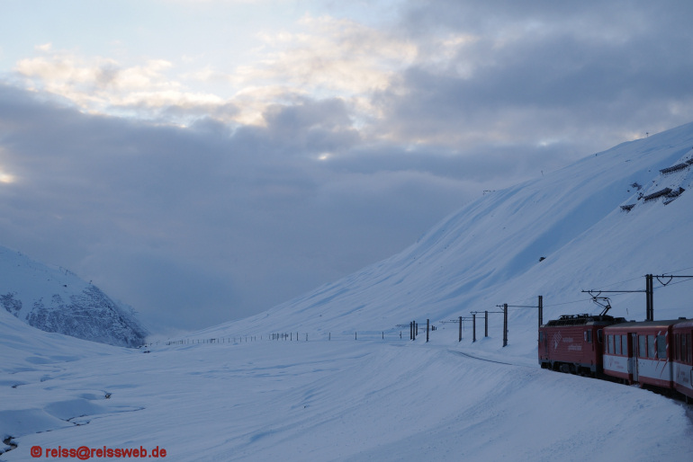 HGe 4/4 II 103 der MGB fährt mit dem Regionalzug 863 hinunter nach Andermatt. Knapp zwei Wochen zuvor ging in diesem Gebiet eine Lawine nieder und riss vier Wagen eines Zuges den Hang hinunter. Nur die Lok blieb auf den Gleisen (13.12.2009).
