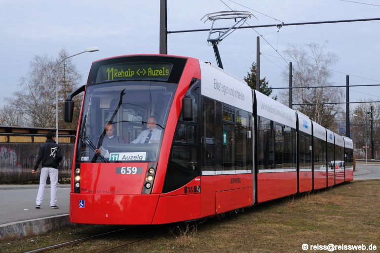 Das Berner Combino-Tram hat die Endhaltestelle Auzelg erreicht (Zürich, 19.03.2010).