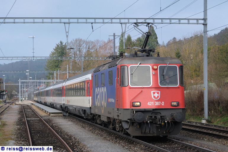 Die ehemalige ICE-Verbindung Zürich - Stuttgart wird seit dem 21. März 2010 "bis auf weiteres" mit lokbespannten Zügen gefahren, die Wagen werden von den SBB gestellt. Am 02.04.2010 durcheilt SBB Cargo 421 387 mit dem IC 282 den Bahnhof Jestetten.