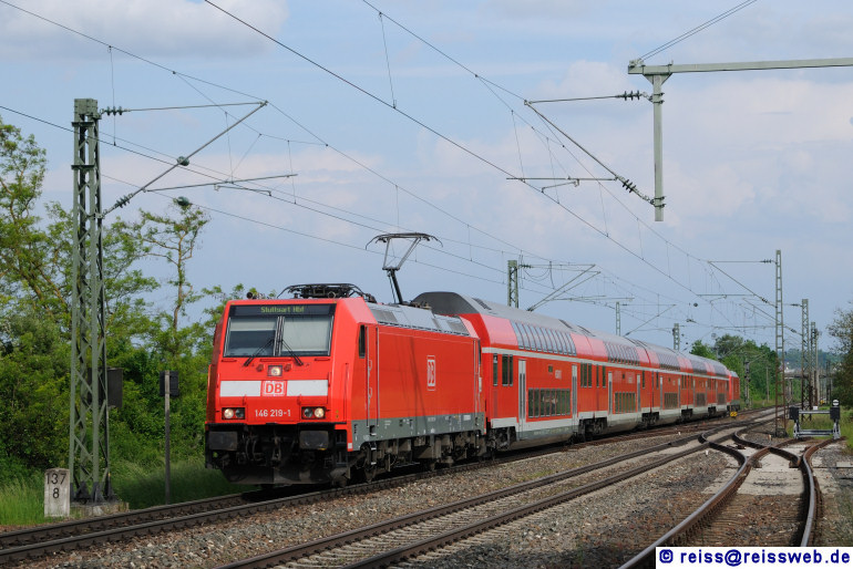 Kanpp eine Viertelstunde nach dem Schwarzwald-Sandwich kam auch der "Stuttgarter" in Sandwichbespannung (146 219 führend und 146 226 am Zugende) durch Welschingen-Neuhausen. Vermutlich fehlte ein Steuerwagen im Umlauf (29.05.2010).