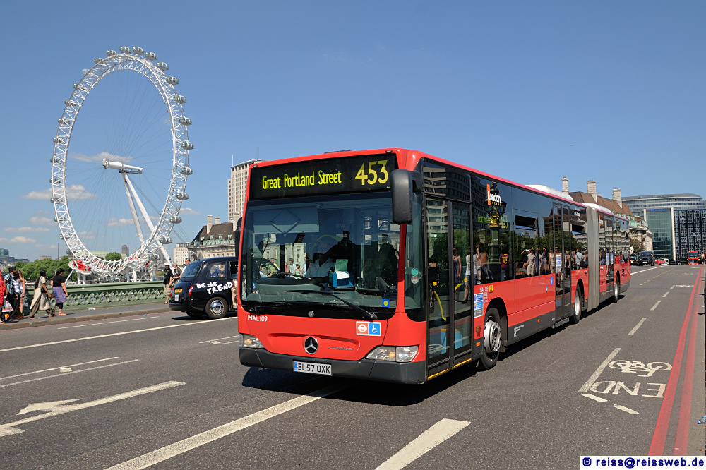 Ein Citaro FL im Einsatz für London General, aufgenommen am 10.07.2010 auf der Westminster Bridge. Im Hintergrund das Riesenrad "London Eye". Seit Dezember 2011 sind keine Citaro-Gelenkbusse mehr in London unterwegs.