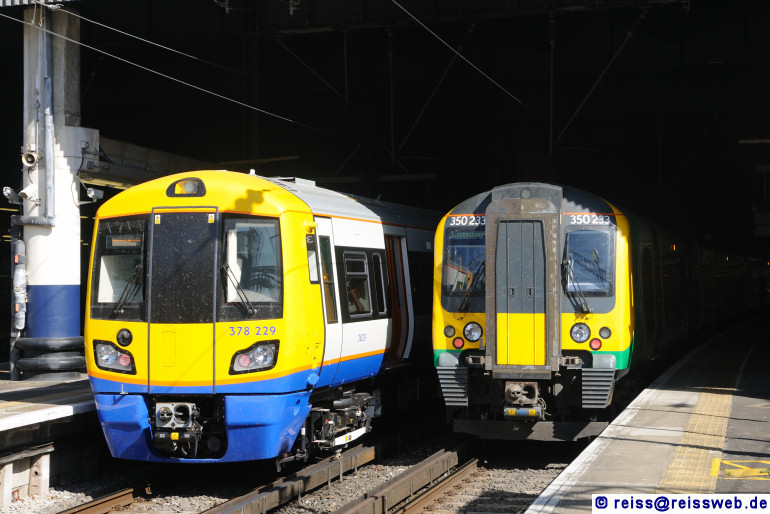 378 229 mit einem Overground Service nach Watford Junction und 350 233 mit einem London Midland Service nach Tring warten in London Euston auf ihre Abfahrt (10.07.2010).