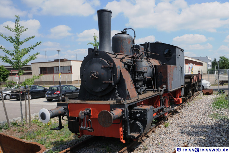 Der 1917 von Henschel an MAN Augsburg gelieferte Nassdampf-Zweikuppler Bauart "Riebeck" wurde nach jahrzehntelanger Abstellzeit bei der Augsburger Localbahn von Dehner-Recycling übernommen und als Denkmal aufgestellt (Augsburg, 20.07.2010).