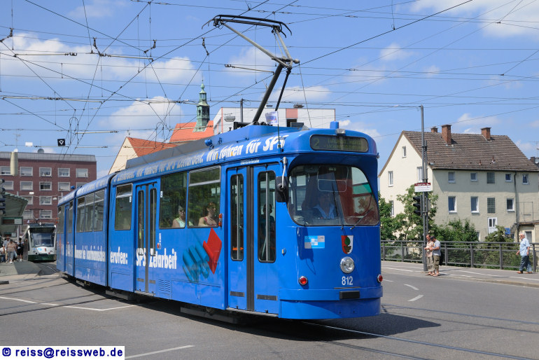 Der Augsburger GT8 812 mit Werbelackierung "SPS Zeitarbeit" ist am 20.07.2010 auf der Linie 2 Richtung Haunstetten Nord unterwegs - aufgenommen wurde er beim Verlassen der Haltestelle Wertachbrücke.