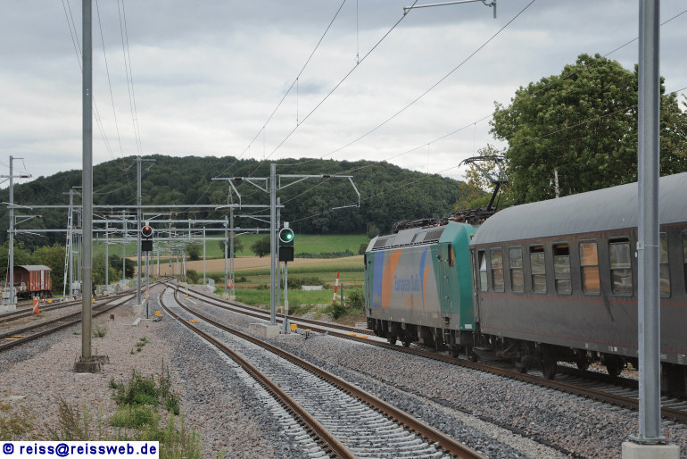 Wesentlich schlechter war das Wetter am Sonntagmorgen (15.08.2010), als 185 541 mit überwiegend müden Reisenden die Rückfahrt ins Schwabenland antrat. In Rafz fuhr sie (wg. Kreuzung mit einem IR) über das neue Gleis 5.
