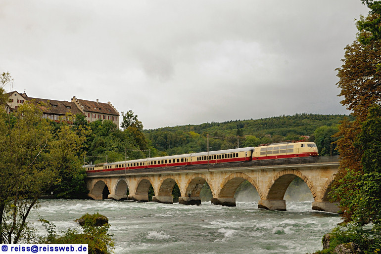 103 184 bringt den Rheingoldzug aus der Schweiz nach Singen, wo er von einer ER 20 übernommem werden wird - Ziel des Zuges ist Tschechien (Neuhausen Rheinfall, 15.08.2010).