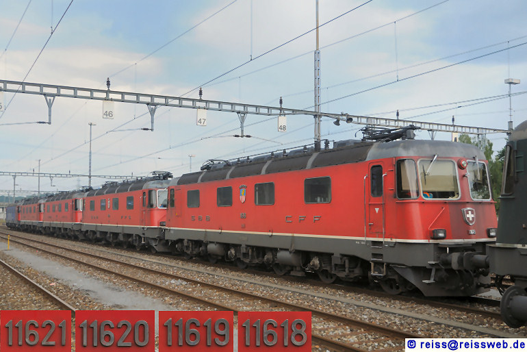 Gleich 6 Re 6/6 stehen in Bülach in der Abstellung, die roten Maschinen sind in der Reihenfolge der Nummern aufgestellt: 11618, 11619, 11620, 11621 - die Nummer der grünen Maschine links und der blau-roten am Ende wurden nicht notiert (23.08.2010).