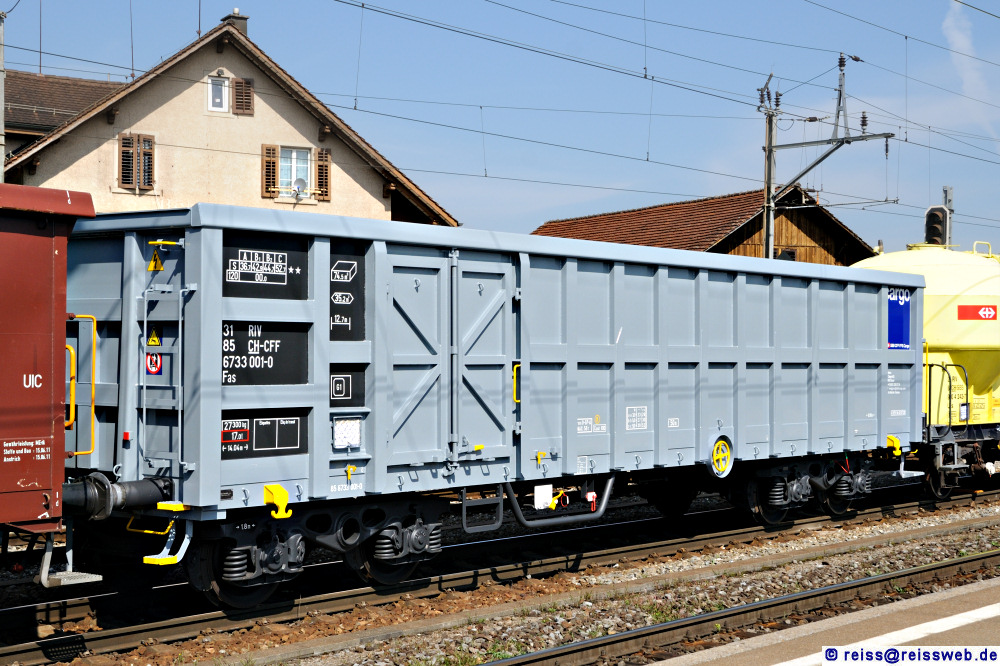 | Fas 31 85 6733 001 - der erste in Tschechien umgebaute Eaos - wurde am 05.09.2010 in einem "Show"-Zug, der von einem Filmteam begleitet wurde, von Basel über Hüntwangen-Wil nach Daillens geführt. Die Aufnahme entstand bei der Wende in Hüntwangen-Wil. |