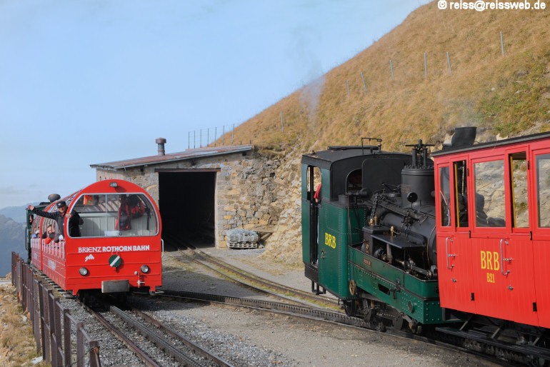 Während Lok 2 mit ihren Wagen auf das Schuppengleis fährt, erreicht ein weiterer Dampfzug das Brienzer Rothorn. Hinter Lok 2 und ihrer Garnitur wartet bereits Lok 6 auf die Talfahrt (10.10.2010).