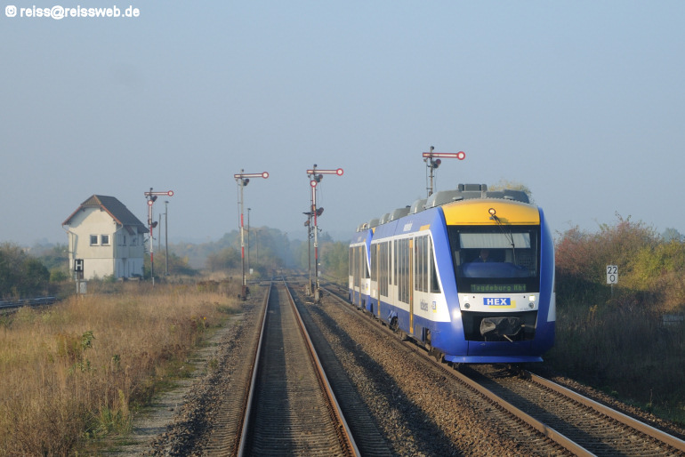 | Noch prägen Formsignale das Bild des Bahnhofs Blumenberg an der Strecke Magdeburg - Halberstadt. Ein Harz-Elbe-Express (HEX), bestehend aus 648 287/787 (LINT 41) und einem unbekannten 640 (LINT 27), fährt von Halberstadt kommend in Blumenberg ein (14.10.10). |