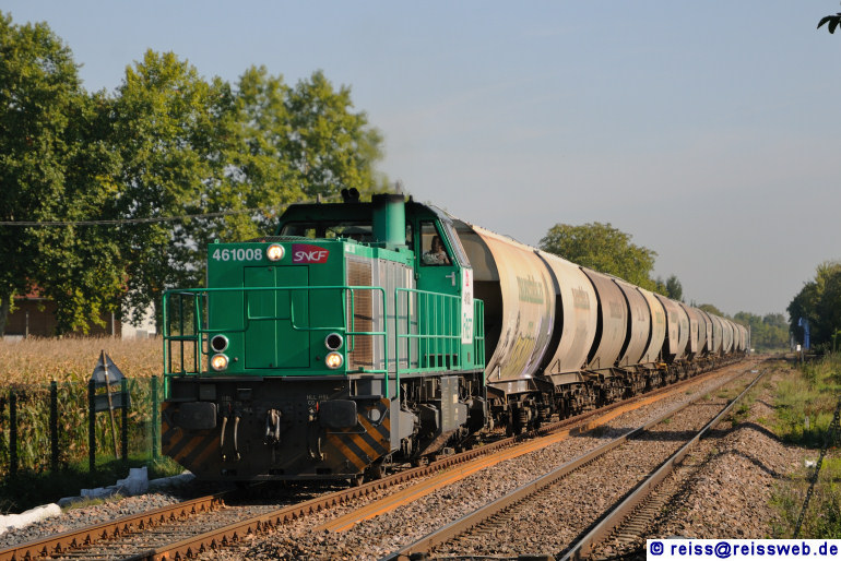 BB 61008 bringt einen Zug mit Getreidetransportwagen aus dem Industriegebiet Beinheim nach Strasbourg. Die Aufnahme entstand im Gemeindegebiet von Auenheim an der Strecke Strasbourg - Lauterbourg (16.09.2011).