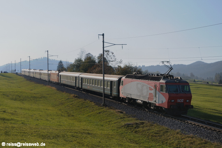 Nachschuss auf den Voralpen-Express oberhalb Biberbrugg. Wenige 100 m später wird sich die Schiebelok vom Zug lösen und nach Samstagern zurückkehren (22.10.2011).