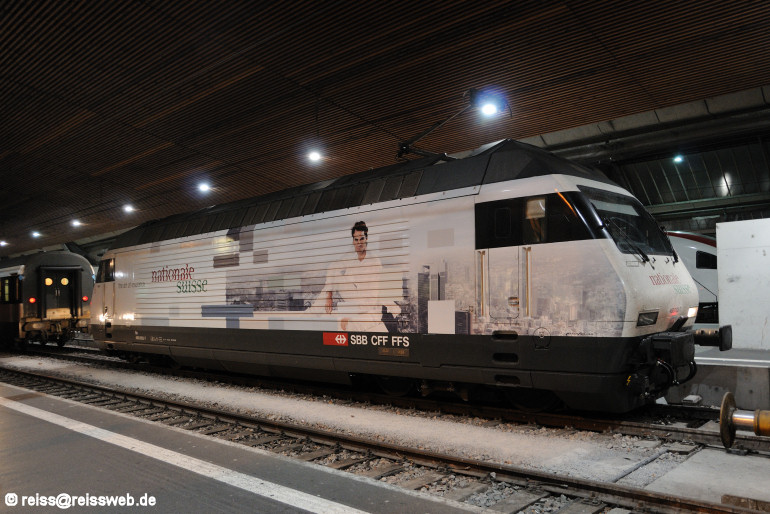 460 003 ist seit dem 23.09.2011 mit Werbung für den Hauptsponsor von Roger Federer, der Versicherungsgesellschaft "Nationale Suisse", unterwegs. Die Aufnahme entstand am 26.10.2011 im HB Zürich.