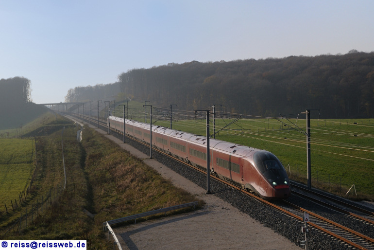 | Bis zur fahrplanmässigen Inbetriebnahme der LGV Rhin - Rhône (Dijon -) Villers-Les-Pots - Petit-Croix (- Mulhouse) können die von NTV bestellten AGV-Züge eines der beiden Gleise belegen. Sie sollen 50'000 km unter 25 kV / 50 Hz zurücklegen (Marloz, 15.11.2011). |