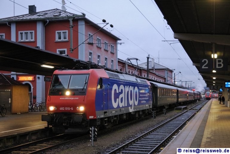 482 010, die den Nostalgie-Rhein-Express von Basel nach Offenburg gebracht hatte, war auch von Singen bis Basel wieder an der Spitze des Zuges, hier beim Fahrtrichtungswechsel in Singen. 01 1066 kehrte als Lz nach Rottweil zurück (07.01.2012).