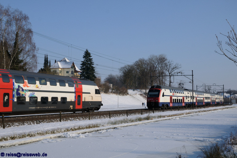Zufallstreffer - Begegnung zwischen IC 825 links im Bild und einem Dienstzug(?) am (zugefrorenen) Kanal in Bürglen (05.02.2012).