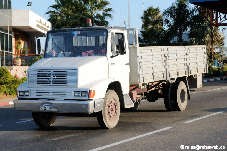 Ein vermutlich in Brasilien gefertiger LKW Marke Daimler-Benz vom Typ L1214 hat eine Mautstelle am Ende der Autobahn A2 Oujda - Sidi Allal el Bahraoui passiert. Ein Bild eines vergleichbaren Fahrzeugs, aufgenommen in Mexiko, siehe