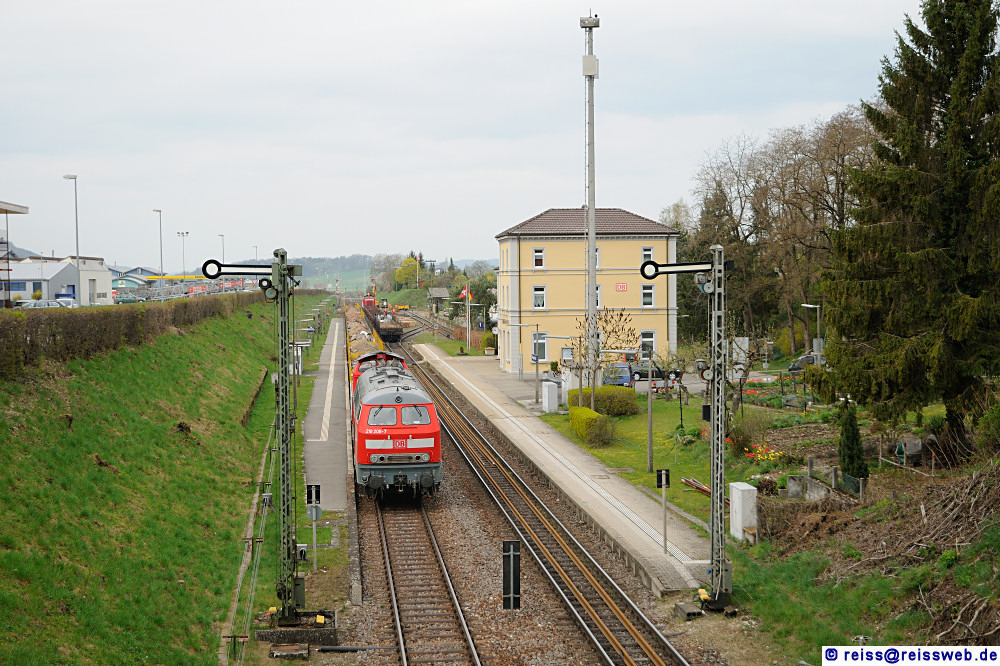 218 208 & 212 034 warten mit einem beladenen Abraumzug im Bahnhof Beringen auf die Weiterfahrt (14.04.2012).