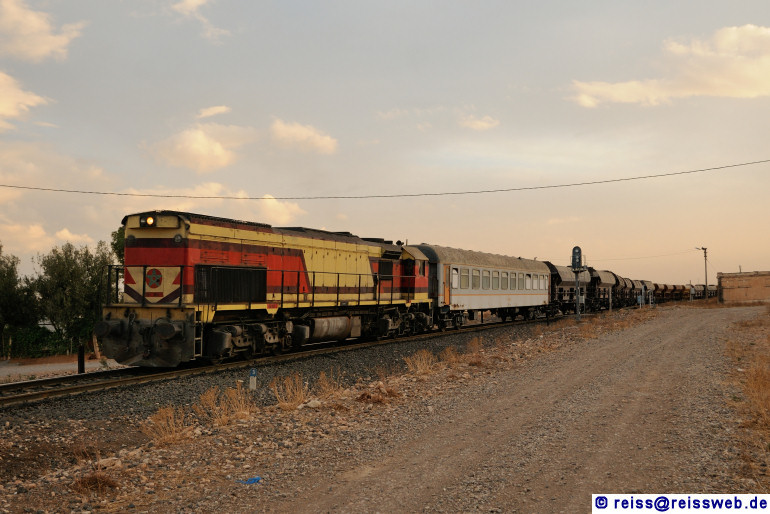 Die Sonne war gerade am Horizont verschwunden, als der Güterzug aus Bouârfa sich in Richtung Oujda aufmachte (Beni Oukil, 28.09.2012).