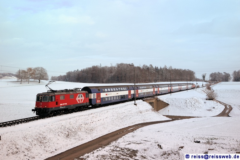 Eine HVZ-Lion-Garnitur mit 420 209 an der Spitze und 420 221 am Zugende fährt bei Marthalen Richtung Schaffhausen (07.02.2013).