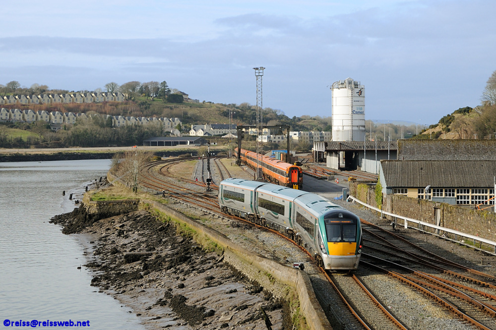 Ein Dieseltriebwagen der Reihe 22000 verlässt Waterford in Richtung Dublin Heuston (09.02.2013).