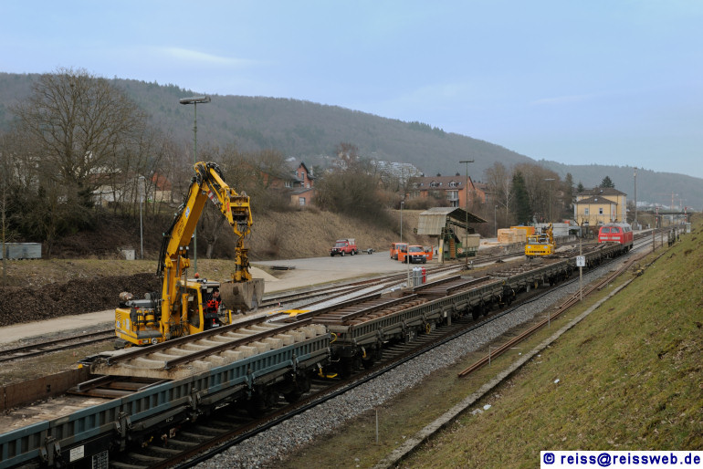 Am 07.03.2013 waren im Bahnhof Beringen bereits einige Schienenstücke demontiert und auf einen Arbeitszug verladen worden. An der Zugspitze wartet 218 249, um den Zug abzufahren.
