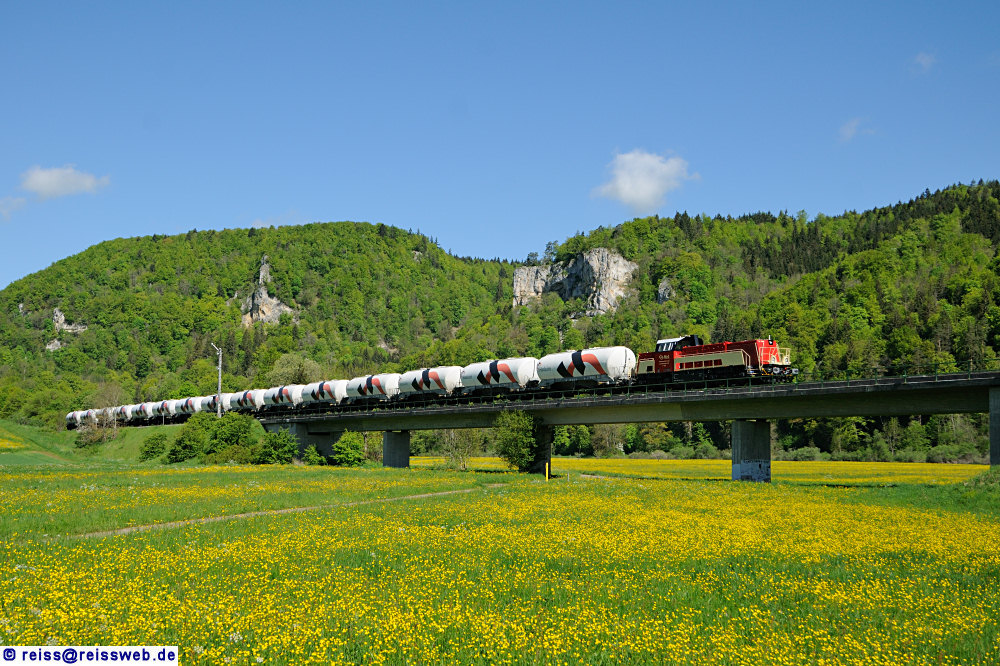 HzL V 180 ist mit einer Leergarnitur Holcim-Wagen auf dem Rückweg von Singen nach Gammertingen und passiert eine Brücke bei Fridingen a. d. Donau (18.05.2013).