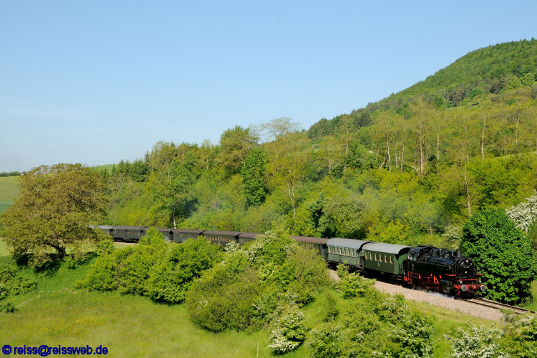 WTB 86 333 bringt den morgendlichen Leerzug von Fützen hinauf nach Blumberg. Die Aufnahme entstand zwischen dem Hp. Wutachblick und der Einfahrt Epfenhofen (08.06.2013).