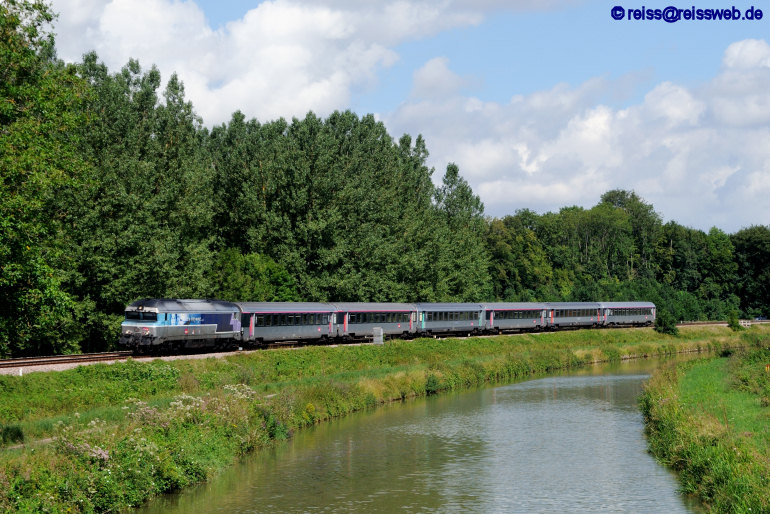 CC 72151 fährt mit Corail 1645 Paris Est - Vesoul bei Luzy-sur-Marne am "Canal entre Champagne et Bourgogne" (früher als "Canal de la Marne à la Saône" bezeichnet) entlang (10.08.2013).