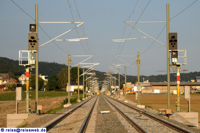 Die Einfahrt Beringen aus Richtung Westen (Neunkirch) gesehen - der Abschnitt von Neunkirch bis Neuhausen ist für Gleiswechselbetrieb eingerichtet (30.08.2013).