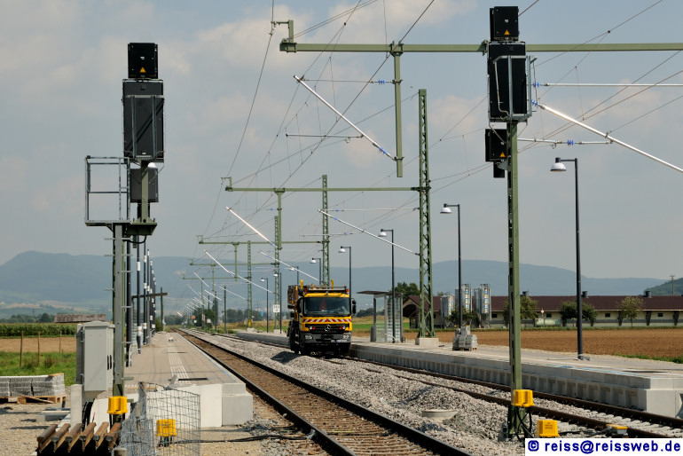 Der Haltepunkt Trasadingen (CH) schliesst unmittelbar an die östliche Ausfahrt Erzingen an. Beide Gleise sind mit Einfahrsignalen ausgerüstet, obwohl man in Wilchingen-Hallau nur aus dem rechten Gleis signalmässig ausfahren kann (31.08.2013).