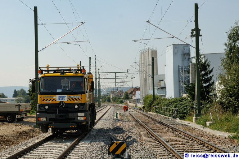 Blick von Osten in die Einfahrt des Bahnhofs Erzingen, links ein Zweiwegefahrzeug von