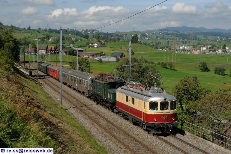 Re 4/4 I 10034 und 1020.042 bringen - zusammen mit der am Zugschluss schiebenden Be 4/4 - einen Sonderzug aus Bludenz über die 50‰-Rampe zwischen Samstagern und Schindellegi hinauf nach Einsiedeln (21.09.2013).