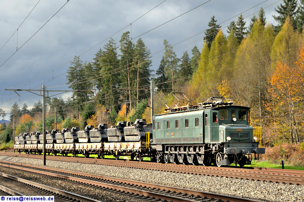 Ae 4/7 10997 bringt zwölf auf Ks-Wagen verladene Panzer vom Typ M113 von Gampel-Steg nach Schaffhausen. Drei der Panzer wurden in Wildegg abgeladen (07.11.2013).