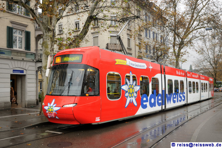 Werbe-Cobra 3087 "Edelweiss" im Einsatz auf der VBZ-Linie 13 an der Haltestelle Sihlquai/Hauptbahnhof (Zürich, 24.11.2013).