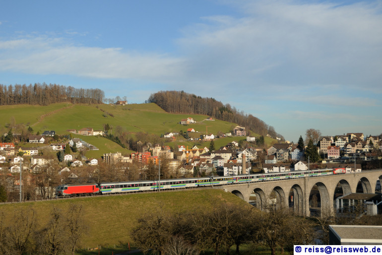 VAE 2422 St. Gallen - Luzern mit SOB 446 015 an der Spitze und 446 018 am Zugschluss überquert das Viadukt in Herisau (07.01.2014).