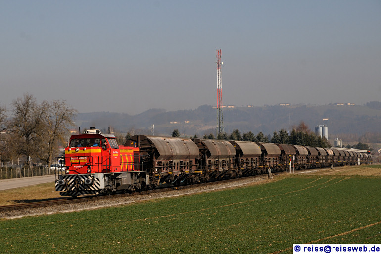 St&H V 20 012 (G 1205, MaK 1000874, Bj. 1992) verlässt Aschach a. d. Donau mit einer langen Garnitur Getreidetransportwagen (25.02.2014).